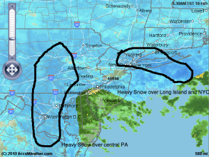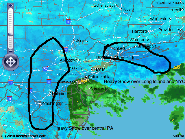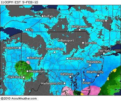 It started to snow at a light to moderate clip at around 8:30 here in Lower Bucks. Ever since, it has been a steady, accumulating snow that has stuck to both the grassy surfaces and roadways. According to my best friend and fellow blogger Jason, the heaviest snow will occur tomorrow morning from 10 am to 4 pm. This will likely be the time where you either make it or break it for this storm. Locations that get hit hard by this heavy snow area will be in the higher end of the snowfall range. Anyway, sit back and relax and enjoy the blizzard, that’s all from me for now. Here is a radar image from right now: