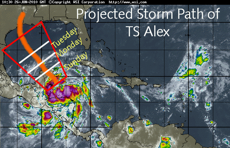 Well everyone, we have our first tropical storm of the 2010 season. This storm has been trudging through the Caribbean for a little over a week now, finally gaining steam and becoming Tropical Storm Alex. Because the storm formed so late and so close to land (Yucatan Penninsula), its strength isn’t expected to exceed a Tropical Storm. As of right now, Alex has no intentions of affecting the Philaburbia Coverage area anytime soon. I will keep you posted on the development of Alex as the week progresses and how (if at all) it affects our area!