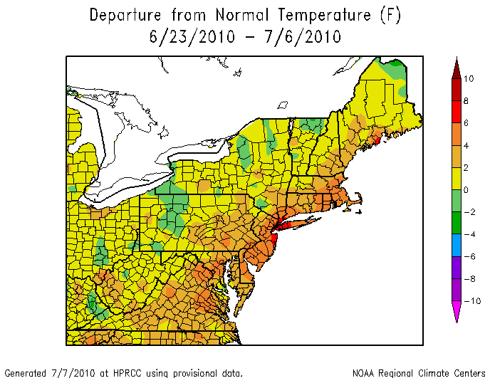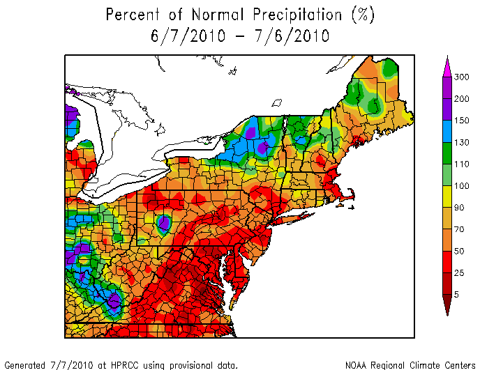 The drought of 2010 continues as temperatures sour into the 100s. Today (7/7) temps will be in the upper 90s and lower 100s. Yesterday, Trenton recorded a high temperature of 104 degrees! 5 people have died from the heat in Philadelphia and thousands of people have lost power. Over the past 30 days, the area has gotten less than 50% of their normal rainfall illustrated by the following map: