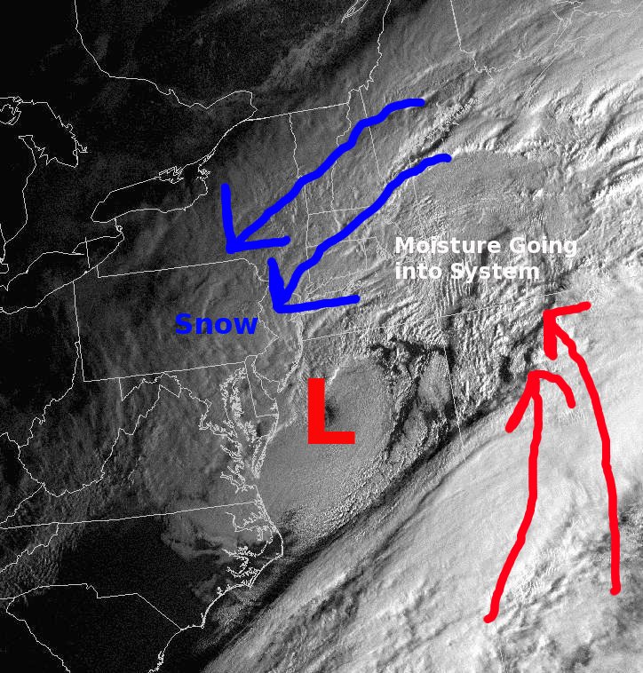 The reason why a Nor Easter gives us snow is that all the moisture from the warm front in the ocean is brought around the storm and ultimately comes from the northeast, mixing with the arctic air and giving us a major snowstorm.