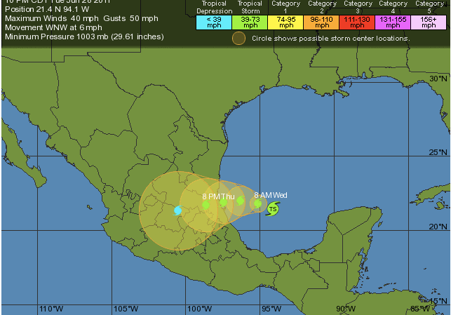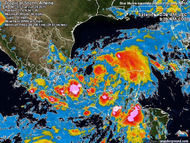 Well, it’s late June and we have our first Tropical Storm of the season. Arlene is located in the Gulf of Mexico and will most likely slam the Mexican coast before dissipating over Mexico. It shouldn’t have any threat to the US mainland whatsoever. If any details change about Arlene, I will let you know. For right now, however, I wouldn’t start worrying about this one.
