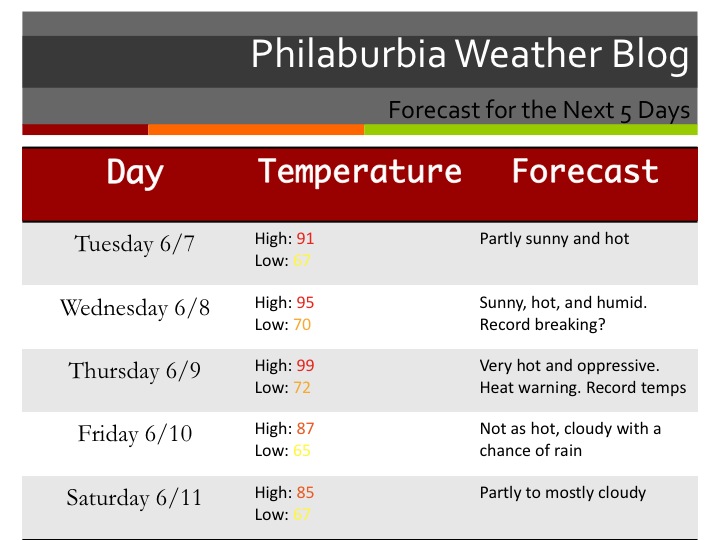 Heat Wave #2: It will be a bad one. After the last week of beautiful weather, it is only mother-nature-like to have a nasty heat wave right after. A very hot air-mass from Mexico will be moving into the area tomorrow, raising the temperatures into the low 90s. By Wednesday, the high could get to 95-96 degrees as the air-mass parks itself over the region. The hottest of the three days will undoubtedly be on Thursday, where the temperatures could reach 100 degrees! Truly amazing stuff for early June. There is an Excessive Heat Warning out for the area, as the air quality will be unpleasant to say the least.