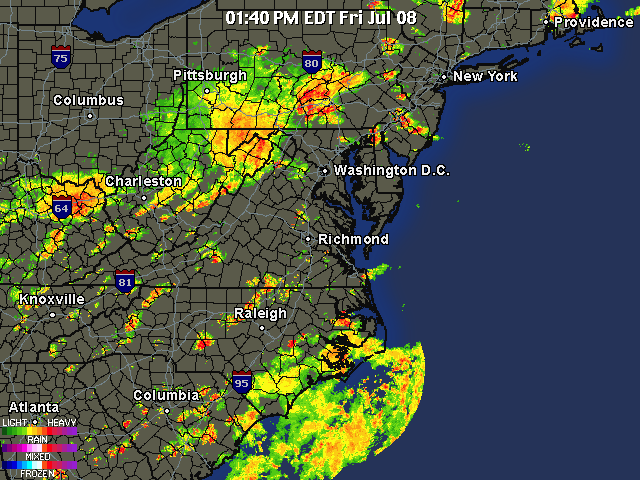 Hi everyone. Well we have another day with severe storms in the forecast. The last few days have had more isolated storms, but today a more widespread event is expected. A frontal boundary associated with a low pressure system is expected to pass through our region later today. Combine the ultra high dew-points with the instability from the front, and we get some fairly nasty storms. Right now there is a flash flood watch for the area because of the slow movement of the storms. Two inches of rain could fall in less than an hour for some of these storms! Expect more storms to pop up and intensify as we head into the late afternoon.
