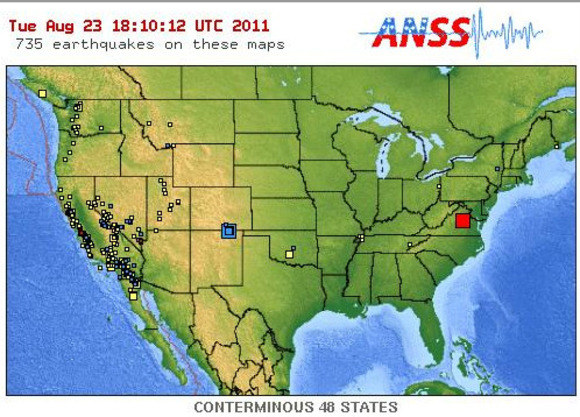 Here is an earthquake map from this afternoon. The map shows an earthquake originating in Virginia (red square):
