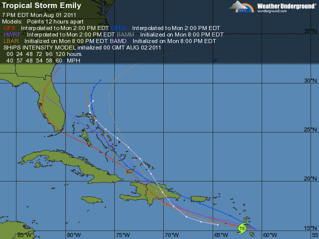Tropical storm Emily has formed in the Caribbean, and will threaten the East Coast this coming weekend. Emily will cut through the Dominican Republic and the Bahamas before cutting North and then Northeast. Right now, the position of Emily all depends on a frontal boundary that will pass through later in the week. If the boundary is weaker and comes in later, Emily will go further Southeast and threaten the East Coast. If the boundary is stronger and faster, then Emily should go more Northeast and will not be a threat to land.