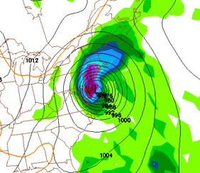 2. The other scenario comes from the GFS (another trustworthy forecast model). It brings the storm a little further east, leaving us out of the hurricane force winds. We would still receive 6 inches of rain, however.: