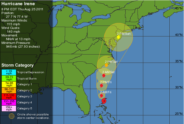 Hi everyone. Not too much change for Irene’s path or strength. One thing to note, however, is Irene’s pressure and strength. Right now she is a category 1 hurricane, but her central pressure is 952 mb. This pressure would normally be equivalent to a category 3 hurricane. What this means is that Irene’s hurricane force winds extend extremely far from her center. As a result, many people will see category 1 gusts in our area.
