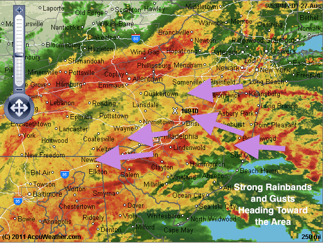 Hi everyone. Just a quick update on Irene. Over the past day, Irene has actually decreased in intensity. She is only a category 2 storm at the moment, with 100 mph maximum sustained winds. She is expected to cross over Cape Hatteras and head up into NJ as a strong category 1. Mandatory evacuations have been ordered for the whole Jersey coast. I would still expect wind gusts to head close to 100 mph at the shore and near 80 mph in the Philadelphia region.
