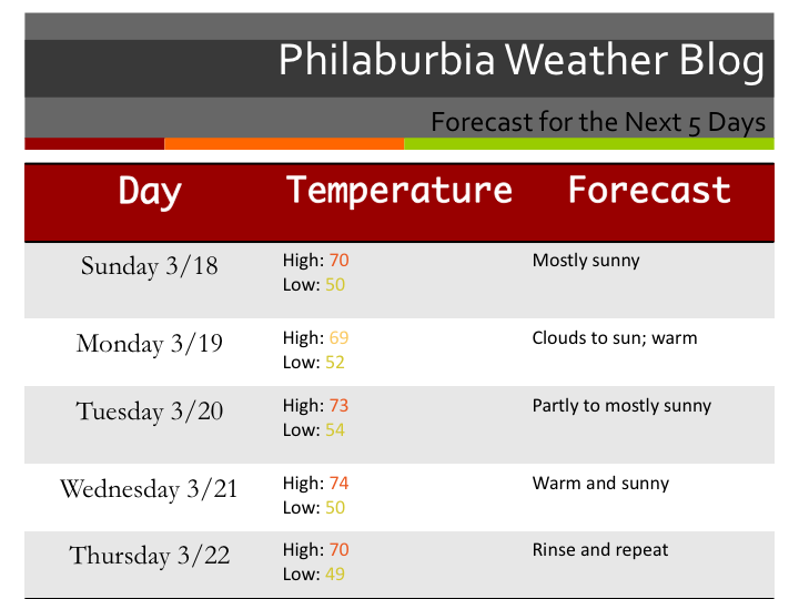 Wow, what a stretch of nice weather we have been having! As I sit here on my patio with an iced tea and a computer on my lap, I cannot seem to remember such a stretch of nice weather in March. Temperatures have been in the 70s and 60s consistently for the past 2-3 weeks and will continue for another 1-2 as a May-like airmass dominates most of the country. The pattern has really slowed down and systems are riding the jet way north. Our next chance of any precipitation will be next Saturday. Until then, enjoy the weather!