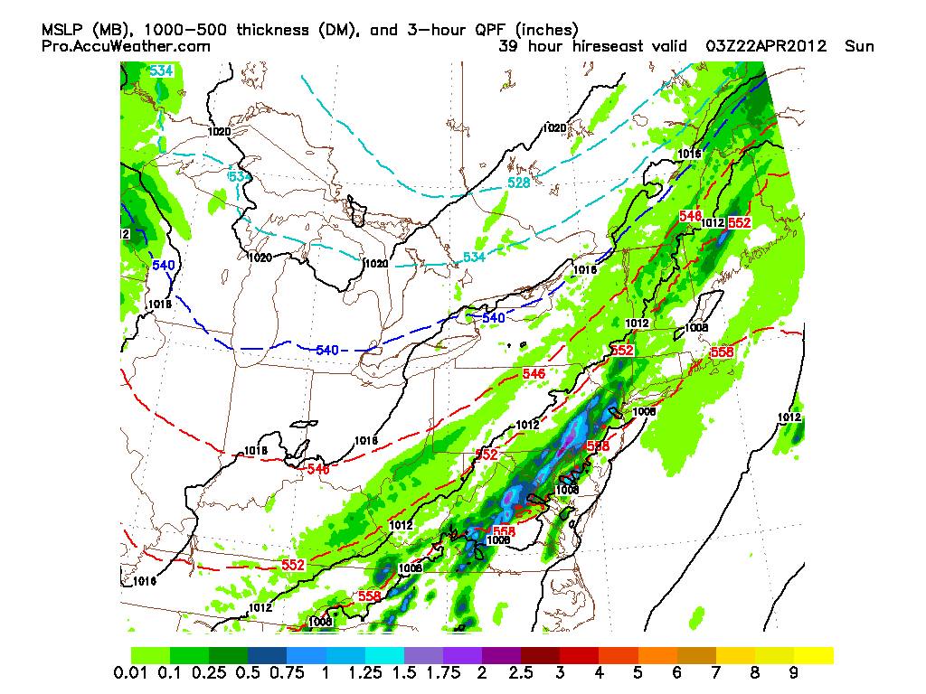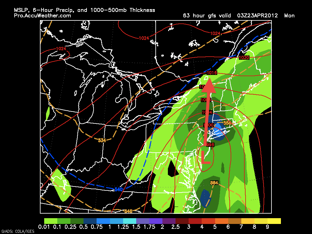 After the squall line moves through, it will phase with a low pressure system moving north. A large and strong nor’easter will form and move northeast, then west into New England Sunday night. This storm will be a major rain maker, and snow could even fall in interior New England and Western PA. Around 3-4 inches of rain will fall by Monday evening. There has been some debate how strong this storm will actually get. If the cold front phases with the storm, it will be strong. If the phasing is weak, then the storm will be weaker. The amount of rain we receive will be based off of the strength and exact path of this storm.