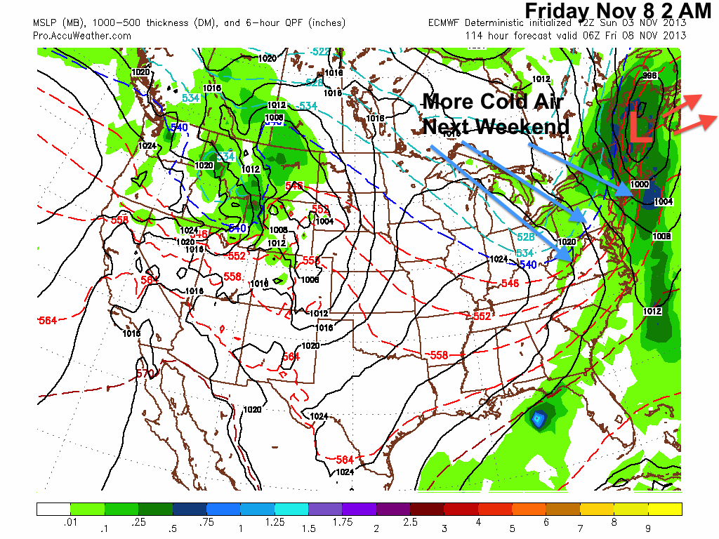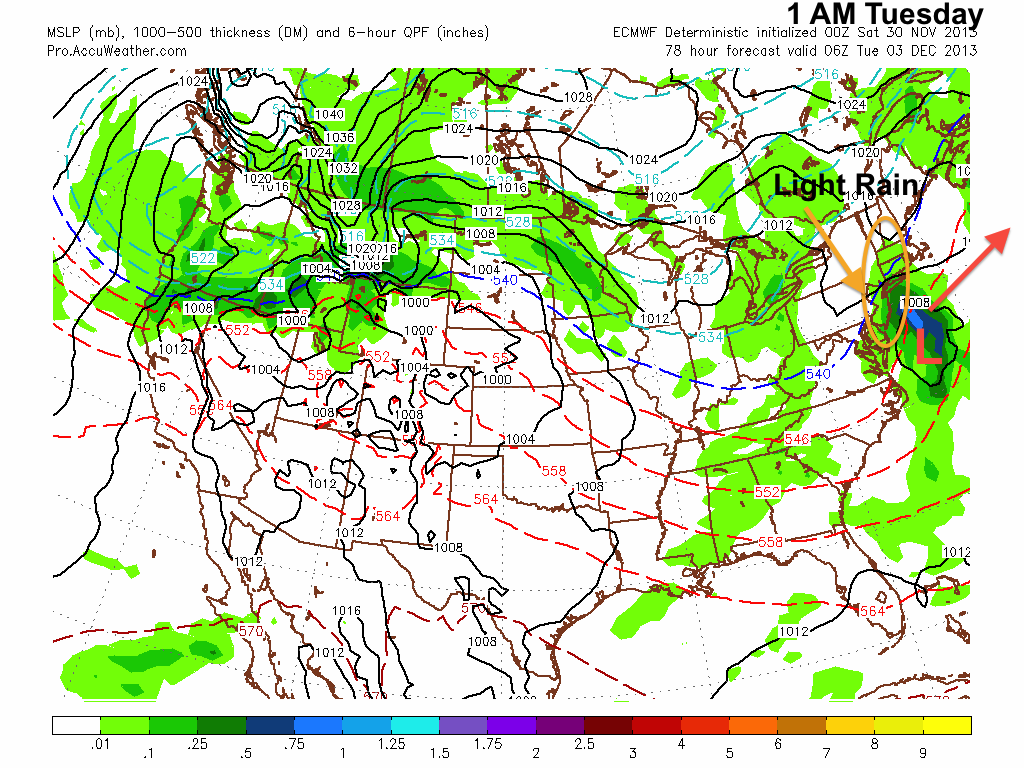 Our pattern is starting to transition toward winter. We are starting to see larger coastal storms (last Tuesday and Wednesday) affecting the Northeast and our high temperatures are starting to stabilize in the 40s. Our weather for the upcoming week is a little odd. Forecast models have been showing a weak low pressure out in the Atlantic, which has the possibility of spinning some precipitation into our area. Any precip that falls will likely be in the form of rain, as the storm will not have enough dynamics to bring in abundant cold air.