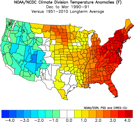 Analog winter: 1990-1991. The first winter I chose to analyze was the winter of 1990-1991. This winter was one of the warmest on record for the Eastern United States. The El Niño recorded during this period was weak (see http://ggweather.com/enso/oni.htm for more), but was likely largely influential on the unusual warmth of this particular winter.