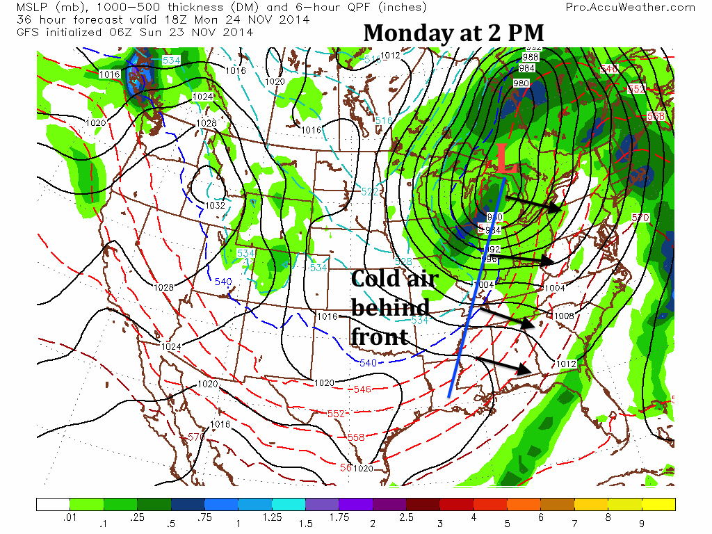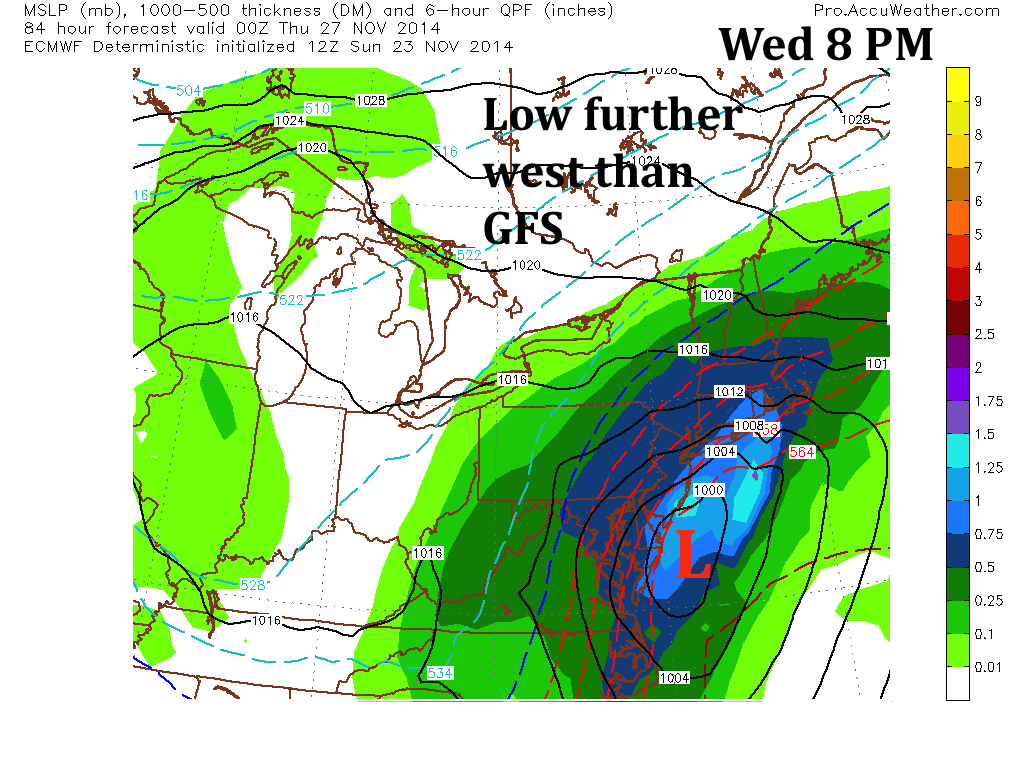 At this point, most forecast models are showing some sort of storm riding up the coast Wednesday into Thanksgiving. Since we are in November, the problem lies in whether there will be mixing during the storm. Upper air temperatures could be above freezing during the storm, especially if it runs close to the coast. This would bring in some wintry mix to the region at the beginning of the storm before changing to all snow.