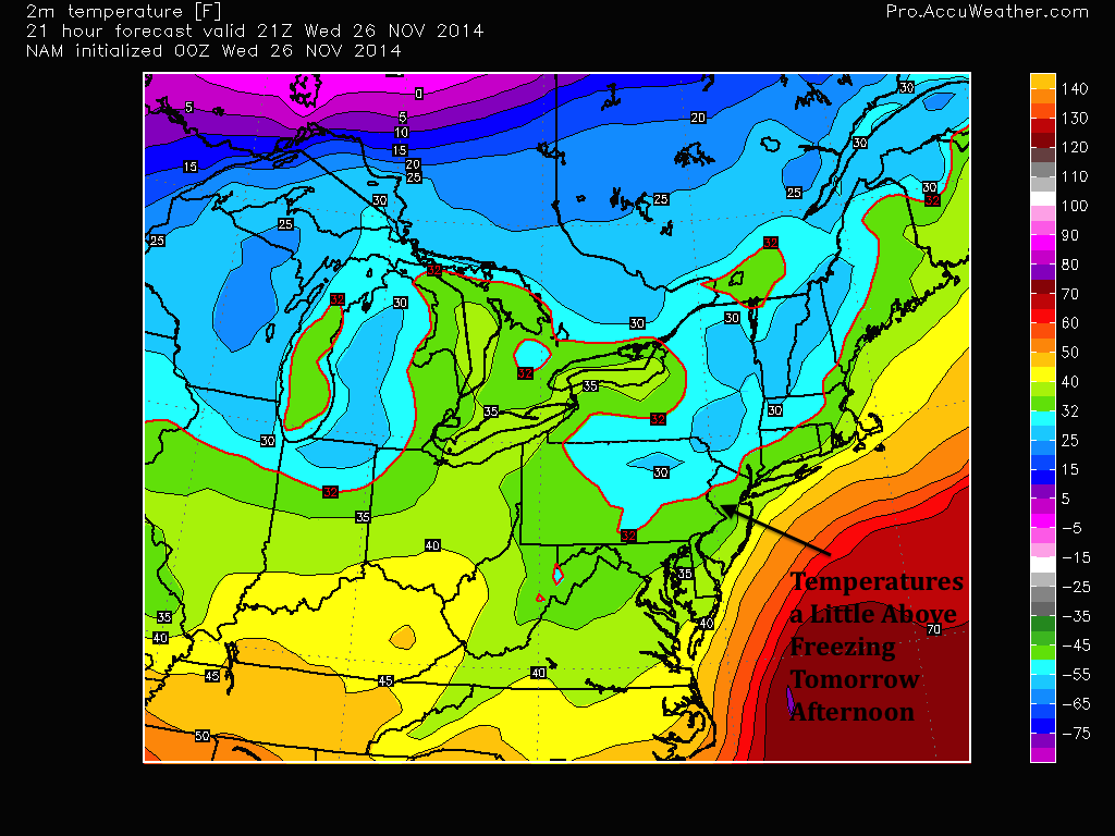 Firstly, surface temperatures will be hovering at or a little above freezing for most of the day tomorrow. This, combined with warm upper air temperatures, will cause the snow to mix with rain initially before changing to snow later in the day. Areas further north should expect an earlier changeover, while most of South Jersey may not see a complete changeover to snow during the storm.