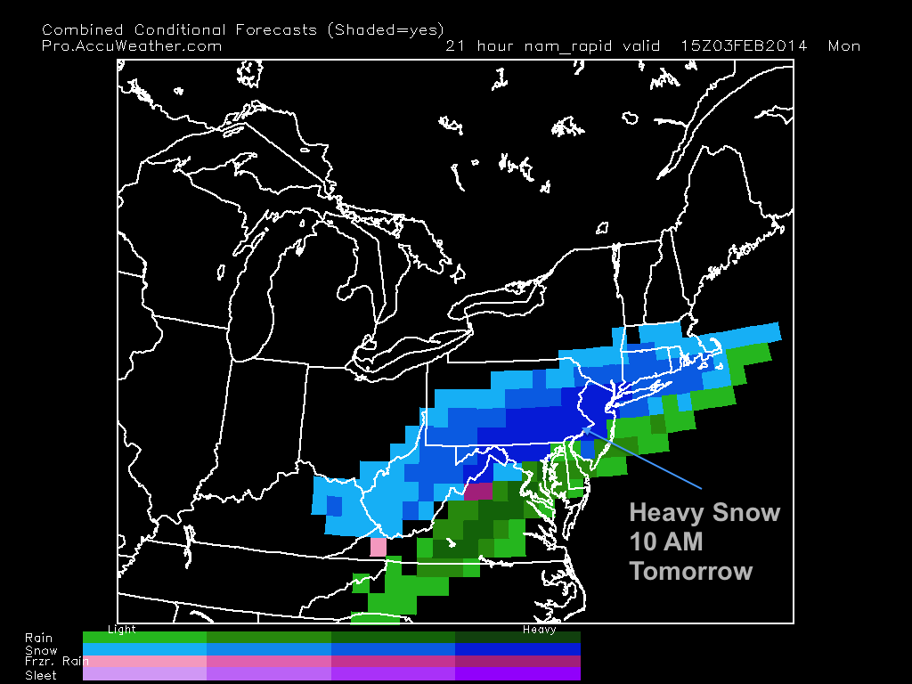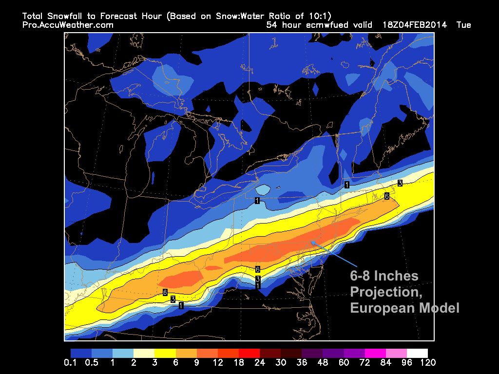 The next storm is expected to arrive tomorrow morning and drop a substantial amount of snow. The system is part of a shortwave coming off of a cold front that will pull through later tonight. The storm will be fast-moving and intense. Heavy snow will fall during the midday hours tomorrow and accumulate a good amount by nighttime. Most models have been projecting a general 6-8 inches with some isolated areas of 8-10. Totals will be held down in South Jersey because of mixing issues.
