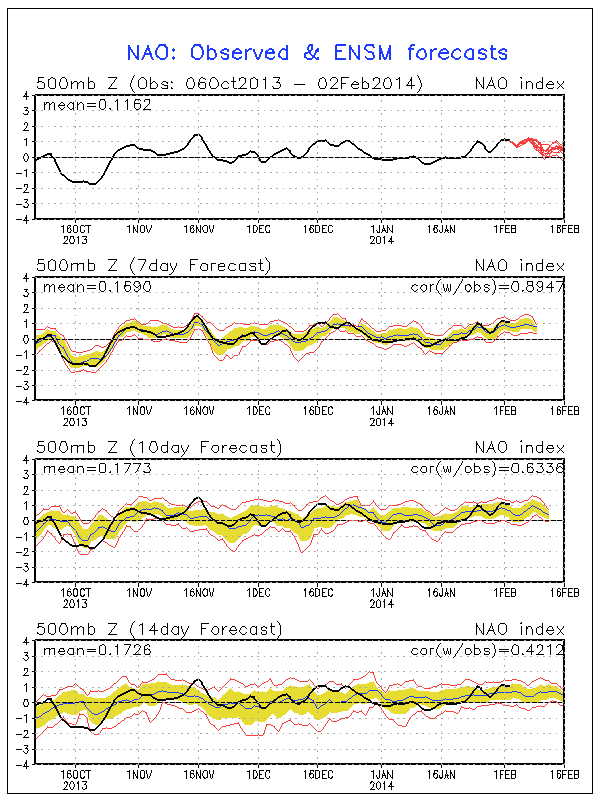 In terms of the current teleconnections, the NAO (North American Oscillation) has been positive for most of the winter and looks to continue to stay positive into mid February.