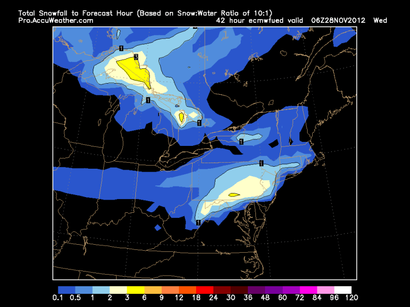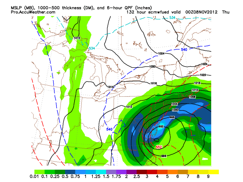 This scenario downright frightens me. Truly. I have seen the destruction from Sandy, and cannot imagine seeing more trees coming down and more power outages occurring. Unfortunately, this scenario is looking more and more likely as we get closer to Wednesday. The European forecast model is currently showing this scenario (note that the European projected Sandy correctly 9-10 days out, so we are dealing with very trustworthy data). The European brings the storm up the benchmark (100 or so miles east of NJ coast) and gives us 3-6 inches of wet, heavy snow. Much like last year’s Halloween snowstorm, this snow will create some major tree damage and widespread power outages. With both scenarios the wind will also be a factor. Our area is already under a High Wind Watch. Gusts will be near 50 mph inland and near 70 mph at the shore.