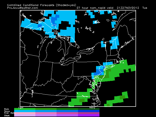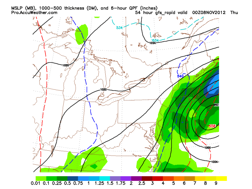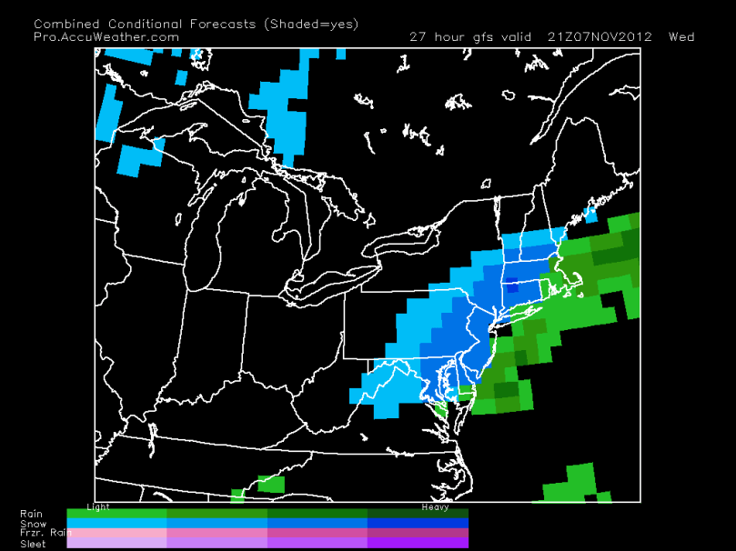 Hey everyone. Just as the area is starting to recover from Sandy, another powerful nor’easter is on its way on Wednesday into Thursday. Originally, I predicted that this storm would be a mainly wind and rain event. There was just not enough projected cold air aloft to support snowfall. But, over the past day or two, the forecast models have been trending toward a more Eastern and stronger scenario. A stronger and further East storm would pull in more cold air, giving us a major snowstorm. Yes, many of you might be thinking, “This cannot be happening. First a hurricane, now snow?” We are in a very brutal pattern right now. Fortunately, after this nor’easter passes on Wednesday, the weather will calm down for a while.